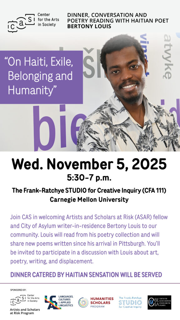 Join CAS in welcoming Artists and Scholars at Risk (ASAR) fellow and City of Asylum writer-in-residence Bertony Louis to our community. Louis will read from his poetry collection and will share new poems written since his arrival in Pittsburgh. He will be joined by Prof. Ausar Stewart who will read a selection of Louis’s work. You’ll be invited to participate in a discussion with Louis about art, poetry, writing, and displacement.
