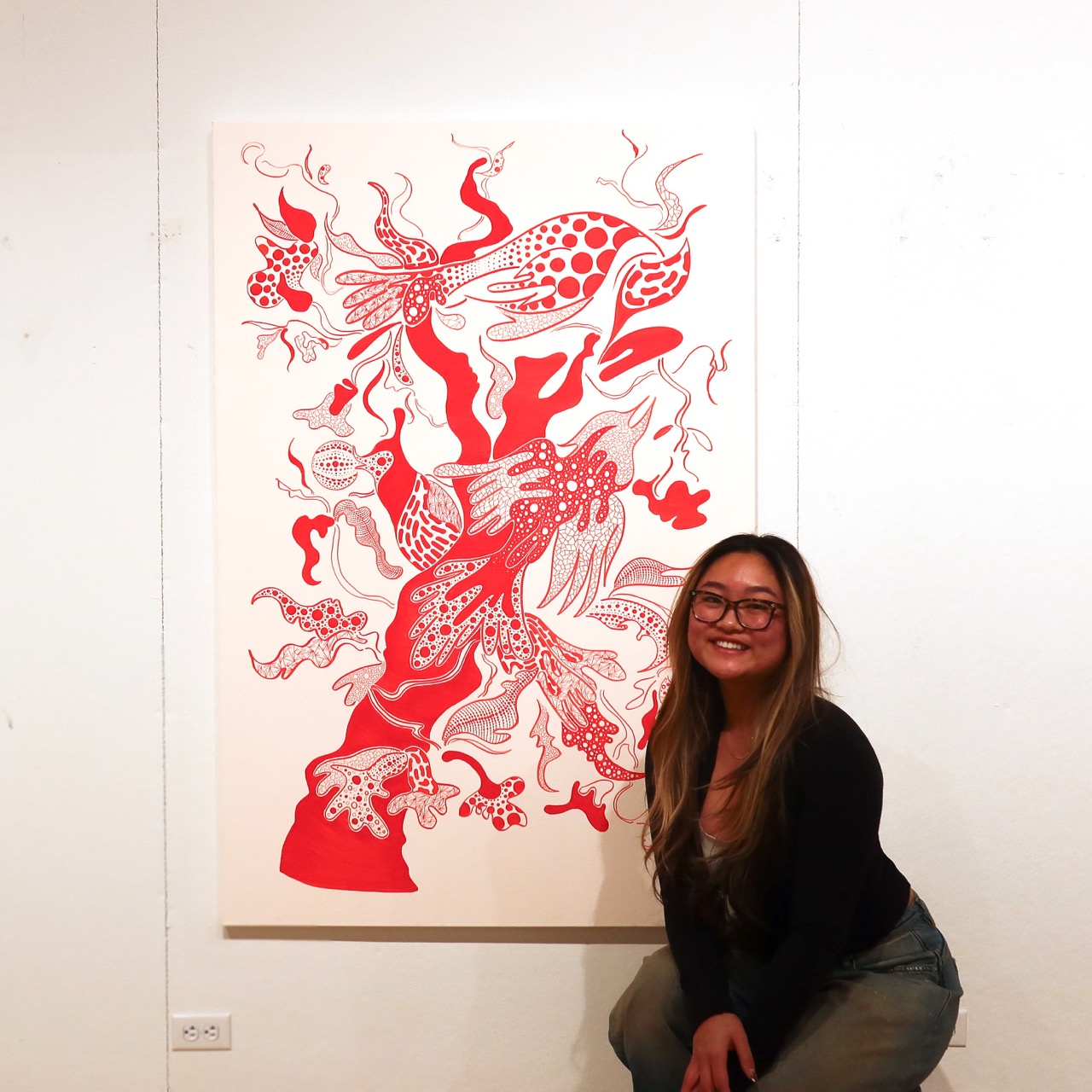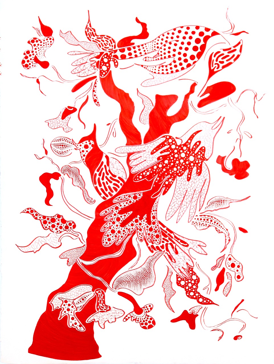 Inspired by Kusama’s use of obsessive repetition, I mainly took inspiration from the pattern. I treated the patterning as a discipline, while adding my own twist to some of her more simple line designs. Inspired by Matisses’s organic linework, I created brushstrokes that followed the same stroke while incorporating my signature linework. The steady repeated markers give the art piece a sense of control and intensity, as if the artwork is built through ritual. By using a bold solid bright red colour throughout the entire drawing, viewers should feel a sense of liveliness and confidence paired with the warm hued background. I chose acrylic markers as my main medium due to their ability to be bold and crisp in imagery, giving it a graphic feeling.