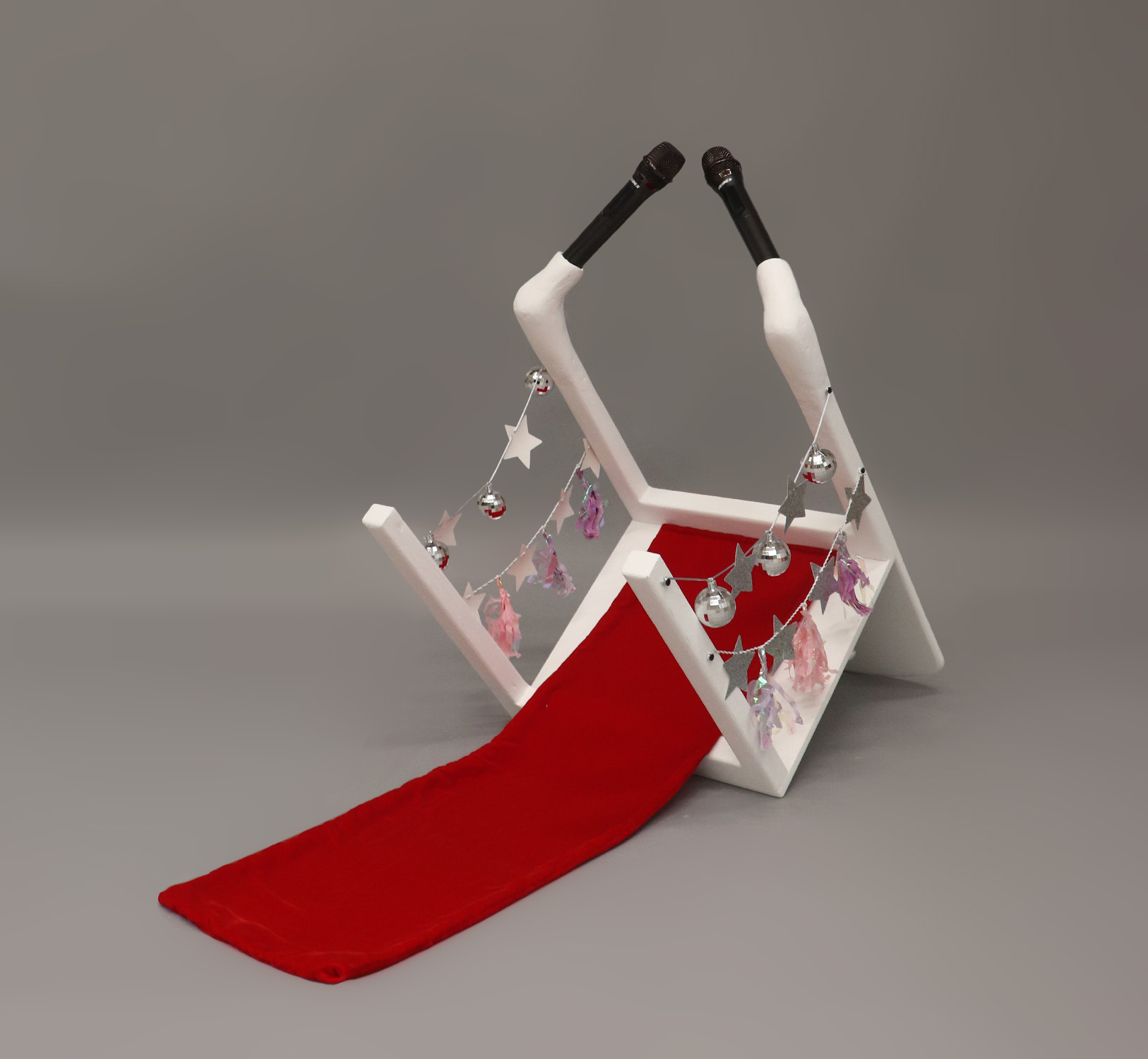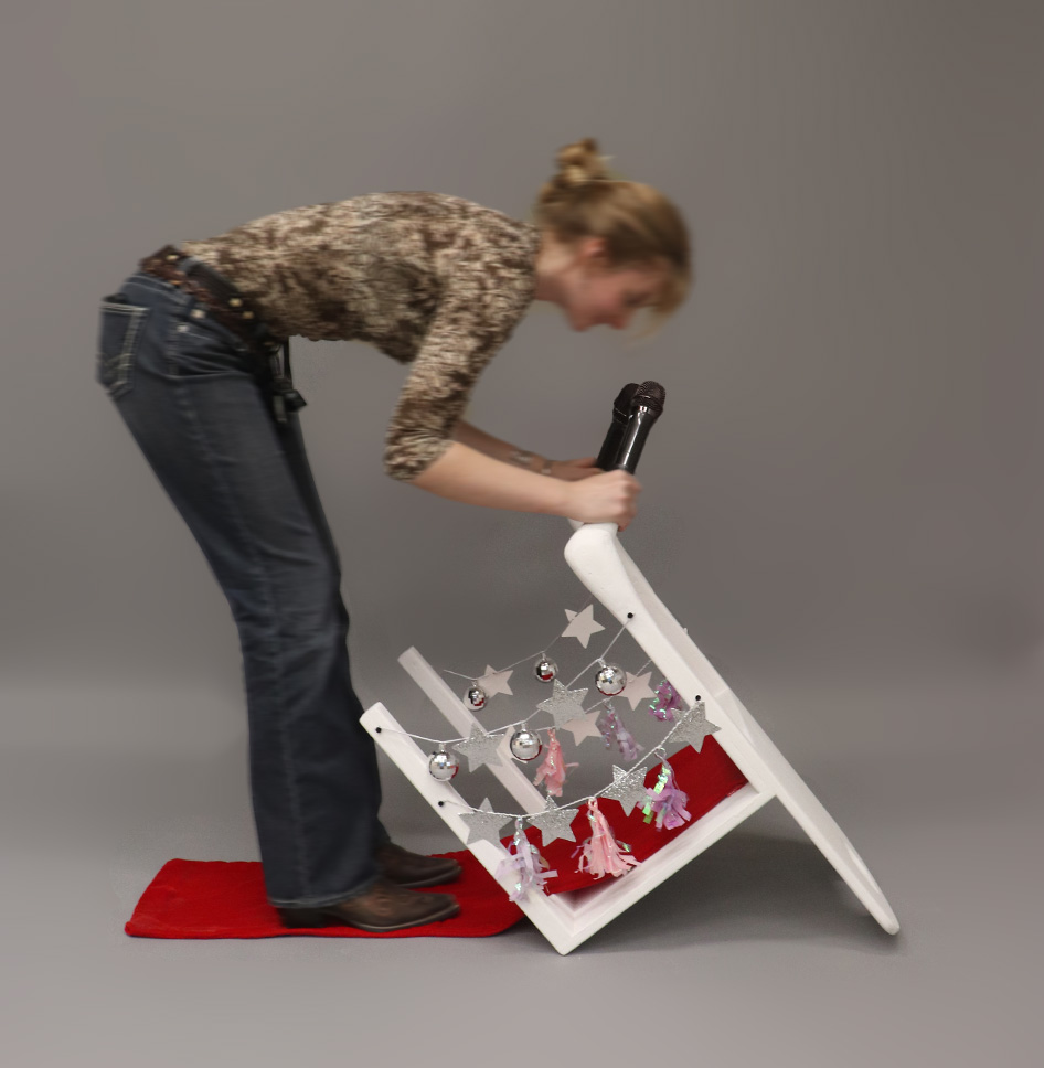 I AM A PERFORMER! references a creative decision very specific to (child) myself, one in which I turn an upside-down plastic chair into an elaborate performance stage. As a child, I would stand on the underside of the chair bobbing up and down while singing and dancing, explaining to my parents that I am “exercising” or “performing” for them. This new contraption assists my child-self in their vision, with microphones attached to the tips of the chair legs, validating my incessant claims that I AM a performer. This piece of furniture can only be used by children. Adults who attempt to use it find themselves contorting into very awkward positions. If they work hard enough, they can successfully speak into the microphones, but it is not natural to them, and it’s not meant to me. This idea parallels one of my strongest beliefs, and the only reason why I envy children; adults have to work to be creative, children don’t.