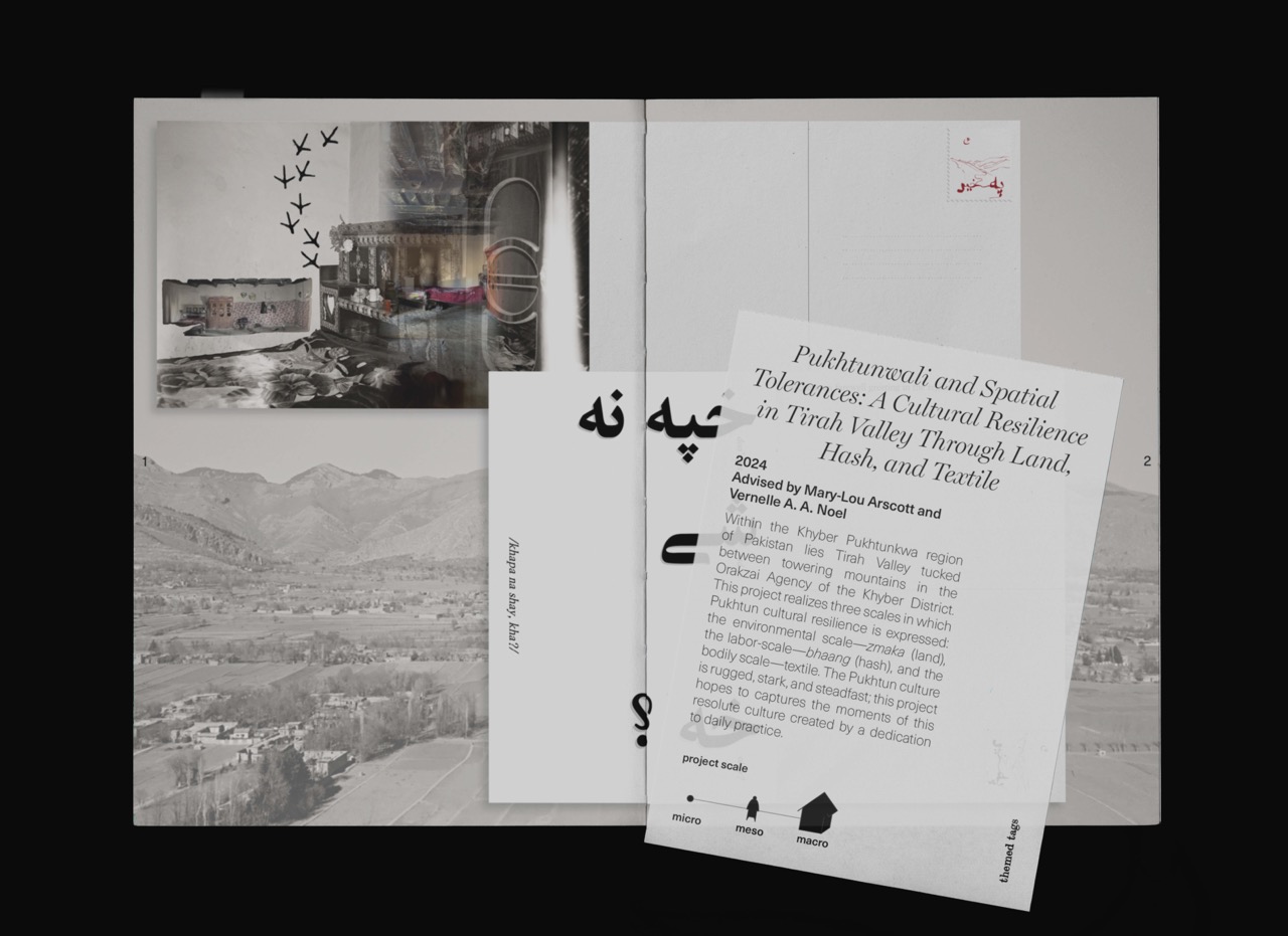 Within the Khyber Pukhtunkwa region of Pakistan lies Tirah Valley tucked between towering mountains in the Orakzai Agency of the Khyber District. This project realizes three scales in which Pukhtun cultural resilience is expressed: the environmental scale – zmaka (land), the labor-scale – bhaang (hash), and the bodily scale – textile. The Pukhtun culture is rugged, stark, and steadfast; this project hopes to capture the moments of this resolute culture created by a dedication to daily practice.