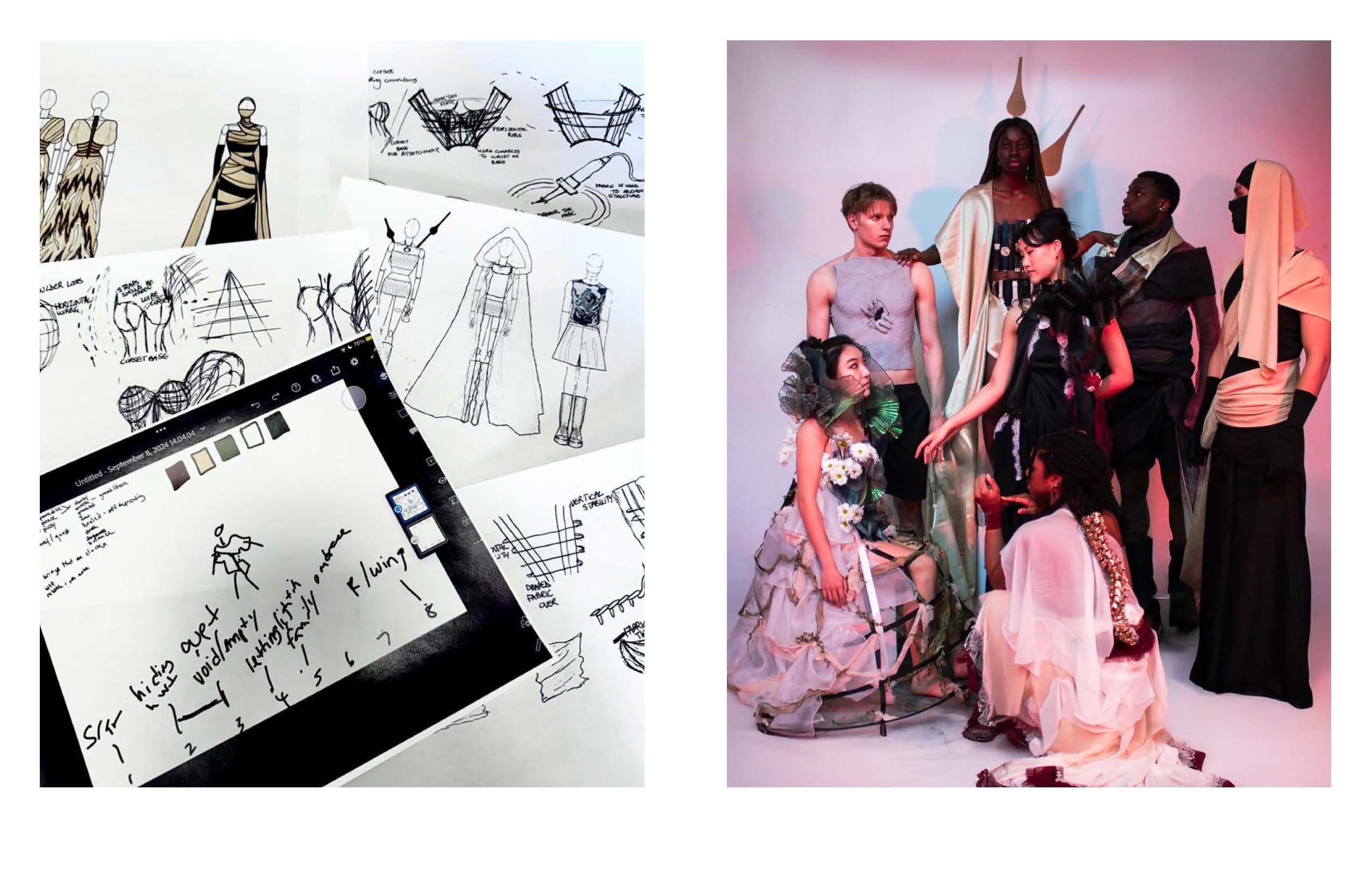 Recuperar-se is an eight-look fashion collection for the 2025 Lunar Gala, exploring the joumey from trauma to renewal. The early designs use torn chiffon, clay corsets, and resin-coated fabrics to evoke pain, emptiness, and dissociation, visually